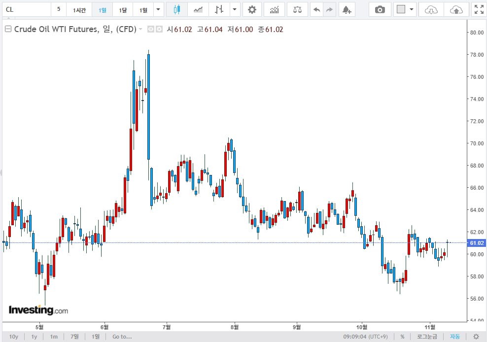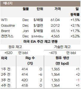 전일 유가는 미국의 러시아 제재 여파와 미국 정부 셧다운 종료의 기대감으로 1.5% 상승한 $61.04에 마감했습니다.