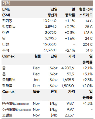 전일 비철금속은 미국 셧다운 종료와 금리 인하 기대감에 상승했습니다. 시장은 빠르면 이번 주 내에 미국 셧다운 종결을 기대하고 있으며, 셧다운 종료 후에는 부진한 경제 지표가 발표되면서 연준의 12월 금리 인하 시나리오가 주목받고 있습니다.
