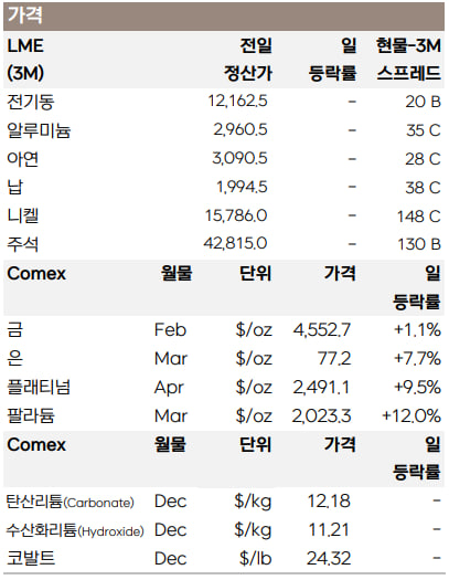 전기동 지난주 목, 금요일 휴장한 LME와 다르게 금요일 거래를 재개한 Comex(+4.7%)와 SHFE(+3.0%) 구리 가격은 큰 폭으로 상승했습니다. 특히 Comex 3월 인도분 구리 선물 가격은 장중 파운드당 $5.888(톤당 $12,980)까지 오르면서 금일 LME 가격의 추가적인 상승 여력을 시사했습니다.