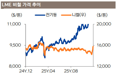 전기동은 미국 전기동 관세 부과 가능성에 따른 지속적인 재고 축적과 중국 제련소의 TC(제련수수료) 하락 소식 등으로 공급 제약 우려가 재점화되며 사상 최고치(톤당 $12,282)를 경신했습니다.
