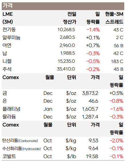 전일 비철금속 가격은 미국의 셧다운 우려와 중국 제조업 부진으로 전반적인 하락세를 보였습니다.