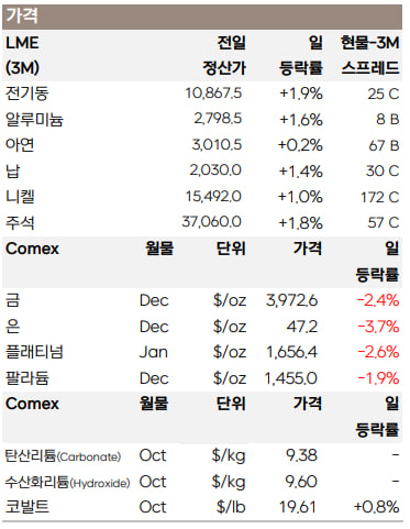 어제 비철금속 시장은 국경절 연휴를 마친 중국이 복귀한 가운데, 구리 공급 차질에 대한 우려가 이어지면서 상승세를 보였습니다.