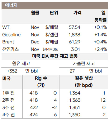 한편 LNG 수출 물량은 10월 들어 164억 배럴로 급증해 사상 최고치에 근접했고, 수출 수요가 가격을 지지했습니다. 천연가스 재고가 평년 대비 4% 높은 수준으로 공급 불안은 제한적입니다. 전반적인 생산 감소와 수출 호조가 가격 하단을 지지하는 한편, 온화한 기온과 높은 재고가 상승세를 제한하고 있습니다.