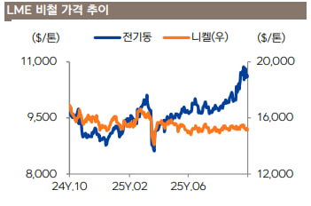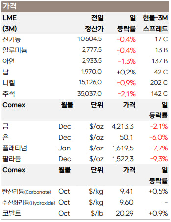 지난주 비철은 미-중 무역 갈등에 주목하면서 전반적으로 하락했습니다. 주 초반 트럼프 대통령이 SNS를 통해 중국과의 관세 전쟁을 원치 않는다고 시사하는 등 중국에 유화적 제스처를 취하면서 일부 품목은 상승했으나, 이후 미국-중국 양국이 상대국 소유 선박에 보복성 항만세를 부과하면서 일제히 하락했습니다. 주 중반에는 다시 트럼프 대통령이 중국과의 디커플링을 원하지 않는다고 언급하자 관계 개선 기대감이 높아지면서 가격을 일부 회복했습니다. 다음 날 연준 인사들의 비둘기파적 발언 또한 달러화 가치 하락과 비철 상승 압력으로 작용했으나, 금요일에는 트럼프 대통령이 또다시 중국을 향해 유화적인 제스처를 보낸 점이 달러화 강세 재료가 되었습니다. 이에 미-중 무역 긴장감이 완화되며 달러 인덱스는 98선 중반대까지 올라섰고, 비철 가격은 하락했습니다.