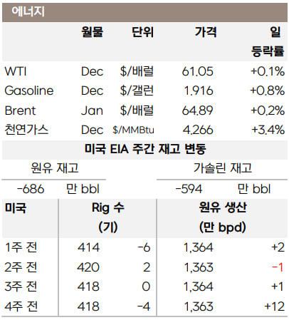 OPEC+가 12월 13.7만 배럴 소폭 증산을 결정했으나 내년 1분기에는 생산증가를 중단하기로 하면서 유가는 지지력을 유지하며 보합세로 마감했습니다.