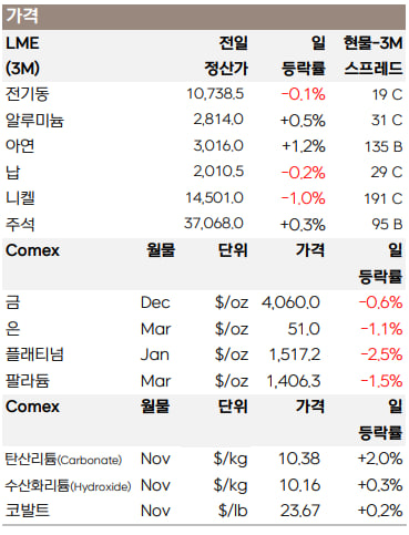 전일 비철은 엔비디아의 깜짝 실적에도 AI 거품 우려를 반전하지 못했고, 미국 고용지표가 엇갈린 신호를 보내며 전반적으로 혼조세로 마감했습니다.