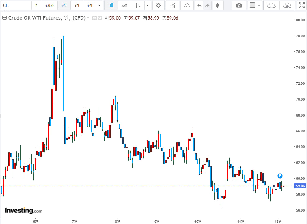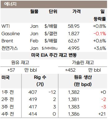전일 WTI는 우크라이나 종전안 합의가 불발되었다는 소식에 0.8% 상승한 $58.95에 마감했습니다.