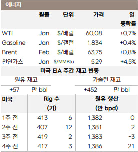 한편, 트럼프 대통령이 베네수엘라 지상 공격을 지시함에 따라 미국의 베네수엘라 군사 개입 가능성이 높아진 가운데, 베네수엘라 생산(110만 bpd) 차질 우려도 시장을 자극하고 있습니다. 다만 OPEC+ 생산이 견조하고 중국과 미국 간 통상 협의 진전 기대가 경기 모멘텀 개선 요인으로 작용하면서, 수급 요인이 뒤섞인 조용한 박스권 장세가 이어지고 있습니다.