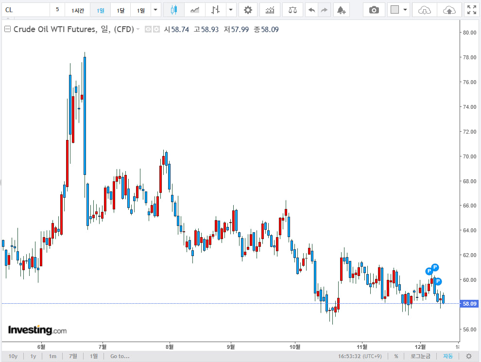 미국이 베네수엘라 인근에서 유조선을 나포했다는 보도에 WTI가 0.4% 상승하며 58.46달러로 마감했습니다.