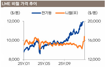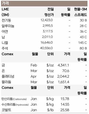 한편, 트럼프 행정부의 구리 관세 부과 가능성 등 정책 불확실성이 CME 거래소 프리미엄을 유발했고, 이는 미국 내 구리 재고 유입을 촉진하며 LME 공급이 제한되는 결과를 낳았습니다. 단기적으로는 1분기 산업 사이클과 계절적 재고 축적 수요가 가격을 지지할 전망입니다.