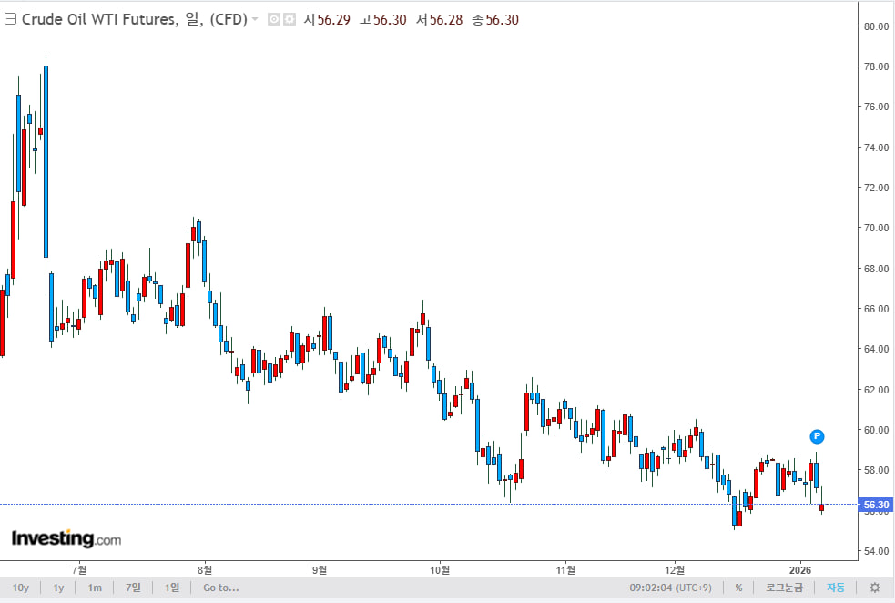 미국 트럼프 대통령이 베네수엘라산 원유 최대 5,000만 배럴을 수입해 미국으로 돌리는 합의가 발표되면서, 공급 증가 우려가 커지자 유가는 이틀 연속 하락했습니다.