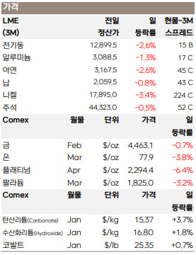 미국의 베네수엘라 공습에 따른 안전자산 수요로 이틀 연속 상승한 결과 화요일 최고 기록에 다시 가까워졌으나, 차익실현 매도가 집중되면서 상승폭을 일부 반납했습니다. 다만 최근 트럼프 대통령이 그린란드 매입에도 군사력 사용 가능성을 배제하지 않으면서 불확실성 재료는 소멸하지 않은 상황입니다. 한편, 최근 패시브 상품 펀드들이 비중 조절을 위해 크게 상승한 품목을 매도한 점도 하락에 기여했습니다.