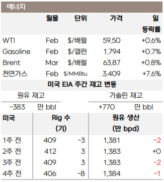 천연가스(2월물)는 LNG 유입량(Inflow)이 사상 최고치를 기록하고, 향후 2주간 난방 수요 확대를 예상하는 한파 전망이 강화됨에 따라 7.6% 큰 폭으로 상승했습니다.