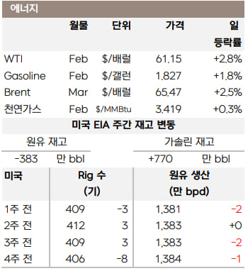 천연가스는 기록적 LNG 수출 흐름(1월 평균 18.8 bcfd, 13일 19.5 bcfd 사상 최고)과 1월 말까지 예년보다 추운 기온 전망으로 난방 수요가 상향되며 소폭 상승했습니다.