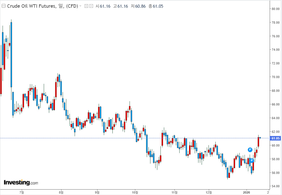 여기에 카스피해 파이프라인을 통해 러시아 연안으로 향하던 그리스 유조선 4척이 드론 공격을 받는 사건도 공급 리스크를 가중시켰습니다. 베네수엘라 제재 완화로 미국이 최대 5,000만 배럴을 단기 내 넘겨받을 수 있다는 보도가 공급 우려를 완화시켰으나, 시장에서는 이란 리스크를 더욱 크게 반영하는 중입니다.