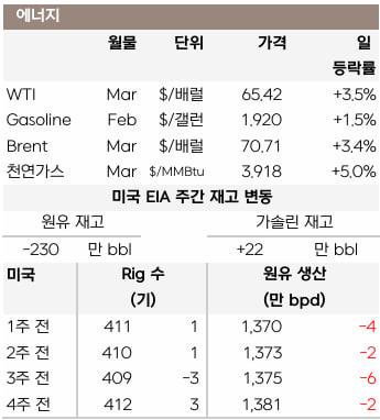 전일 주간 재고는 242bcf 감소해 시장 예상치(230bcf)를 웃돌았고 5년 평균(-208bcf) 대비로는 큰 폭으로 감소했습니다. 미국 내 1월 평균 생산이 106.2bcfd로 12월 생산(109.7bcfd) 대비 둔화했으나, 한파에 따른 남부 생산지 동결로 급감했던 일일 생산은 V자 반등하며 회복했습니다.